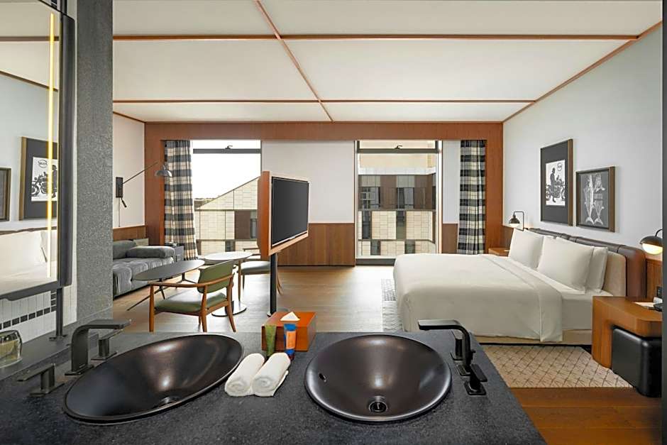 Accommodations span a range from King and Twin rooms to expansive suites, with views that include city, sea, mountain, garden, or atrium. Examples include a King Room, City View at 420 sqft; Flow Executive, King, City View at 657 sqft; Flow Suite, 1 Bedroom, Sea View, Terrace at 1077 sqft; and Suite, 1 Bedroom, Sea View at 1076 sqft. Other configurations feature 377 sqft options with Twin beds and City or Atrium views, or 657–657+ sqft arrangements with terraces and various views to suit different travel moods.
